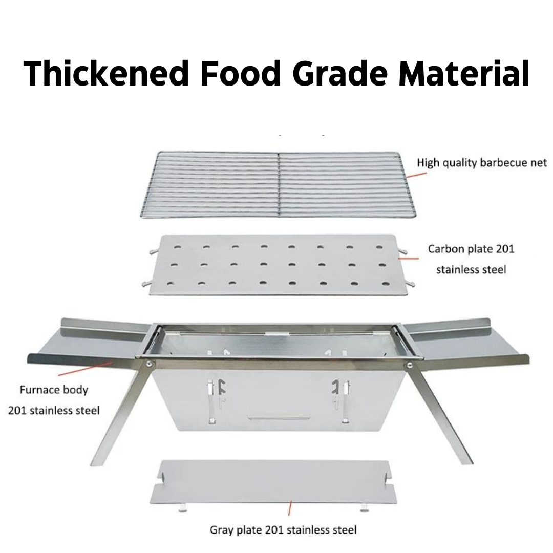 Fast Assembly and Storage in Seconds : Get grilling in no time with our Portable Grill - no assembly needed! Simply take it out of the bag, unfold the legs, place the grill grate, and it's ready for cooking. Packing up is just as easy: dispose of the ashes, fold everything back, and you're done. Quick, simple, and hassle-free.