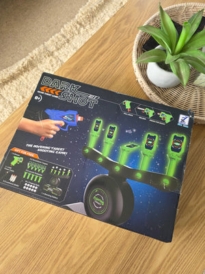 The set includes 1 target, 1 blaster, 5 orbs, 10 darts, and fluorescent stickers for nighttime play.