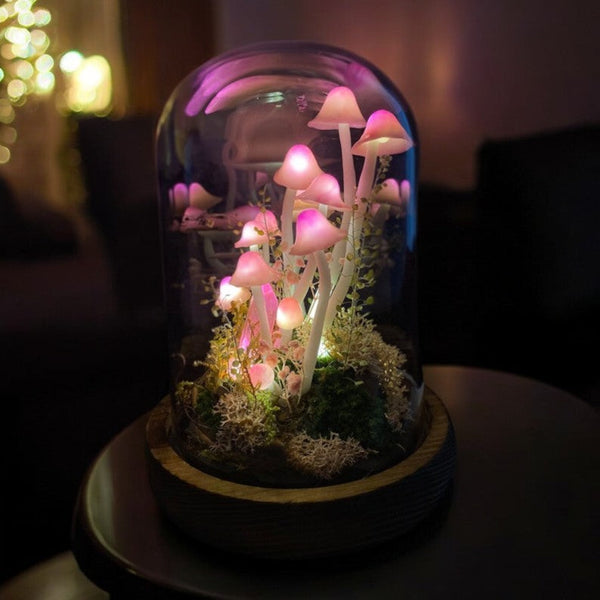 The lamp features a durable glass dome and a wooden base, with handcrafted details that include lifelike plants and figurines.
